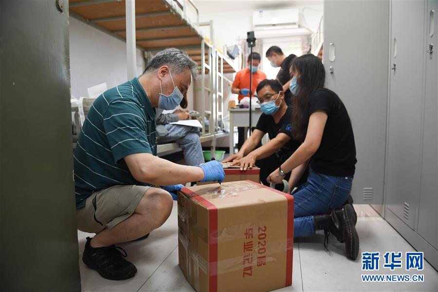 7月15日,在中国人民大学学生宿舍,哲学院老师将毕业生的行李装箱打包。 新华社记者 鞠焕宗 摄