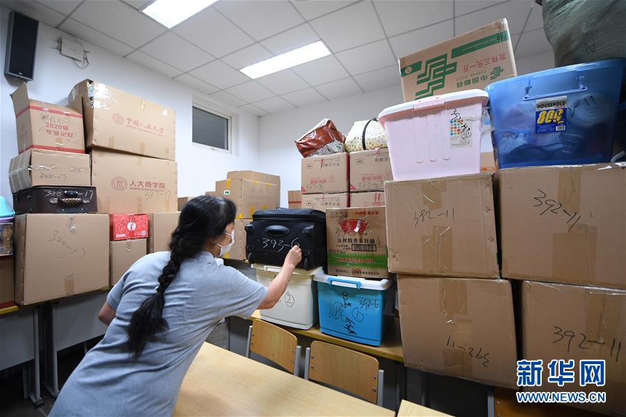 7月15日,在中国人民大学行李寄存处,学校工作人员在毕业生行李上写标签。 新华社记者 鞠焕宗 摄