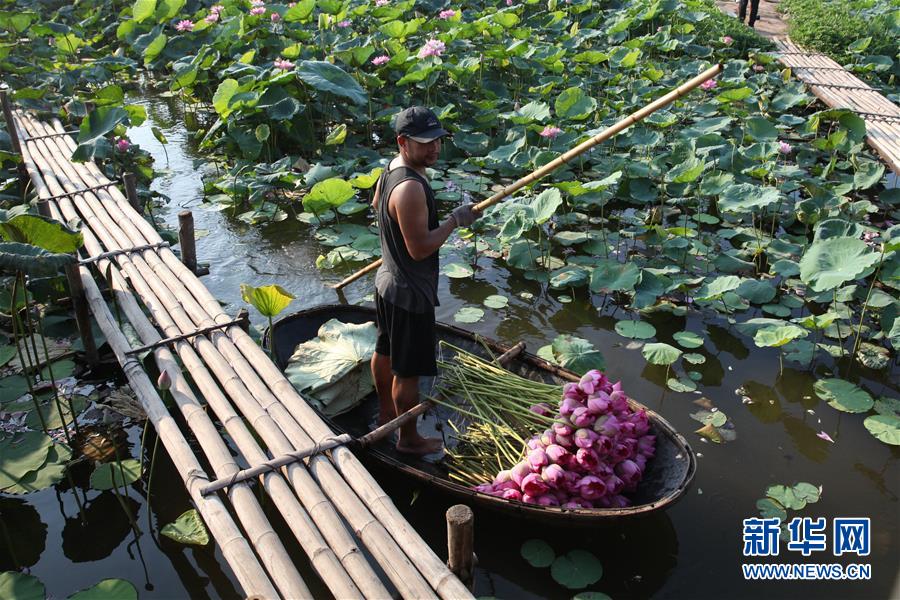 7月15日,花农在越南首都河内的西湖畔采摘荷花。