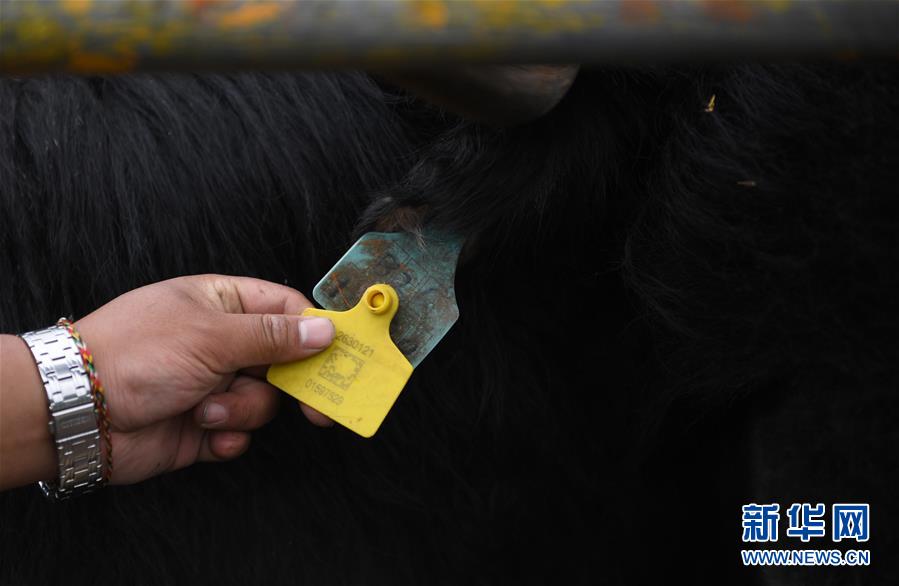 7月20日,青海省大通种牛场,工作人员在核准牦牛耳标信息。新华社记者 吴刚 摄