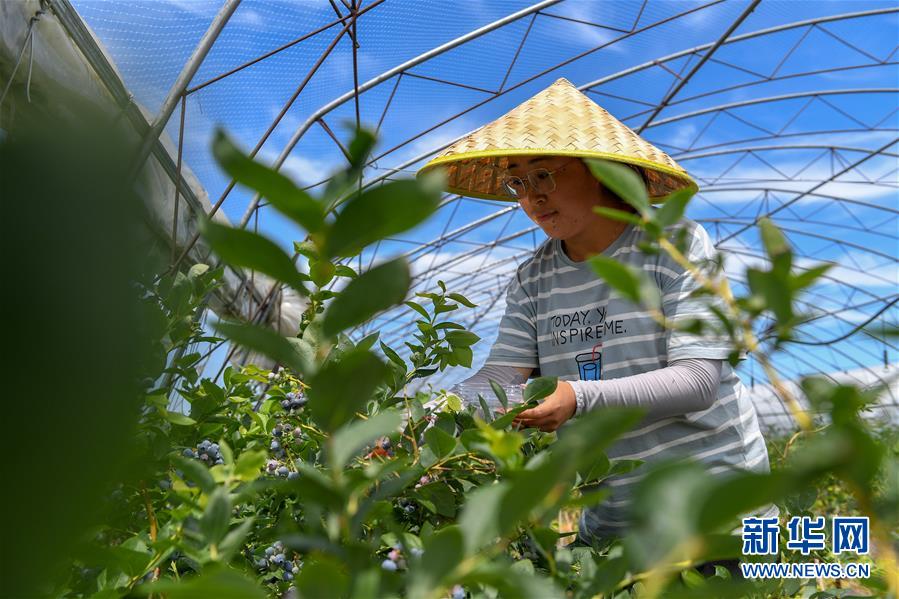 7月21日,在吉林省白城市洮北区青山镇黎明村的大棚里,王伟在采摘蓝莓。 王伟和才洪力毕业于吉林省农业大学,2015年他们带着技术回到家乡白城市,潜心研究种植蓝莓果树。在夫妻二人共同努力下,原本不适宜在吉林西部种植的蓝莓在黎明村大棚里获得丰收,现在年产蓝莓5000斤左右,年产值十余万元。目前,他们正研究将种植技术推广给乡亲们,才洪力说:“我俩先‘打个样’,以后要带动大家一起致富”。 新华社记者 张楠 摄