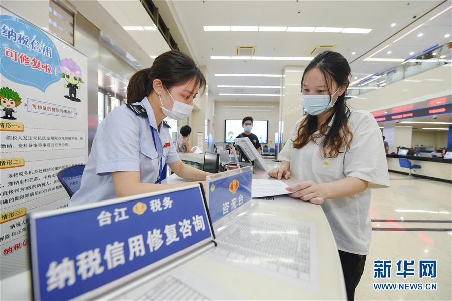 7月21日,在国家税务总局福州市台江区税务局办税服务厅,工作人员为企业代表解答纳税信用修复的相关问题。
