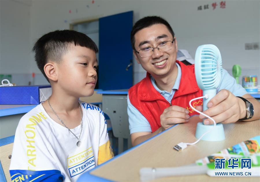 7月21日,在余姚市小曹娥镇的辛慧学校暑期乐园里,余姚市大城小爱公益服务中心的青年志愿者在教孩子如何使用暑期清凉大礼包里的迷你风扇。