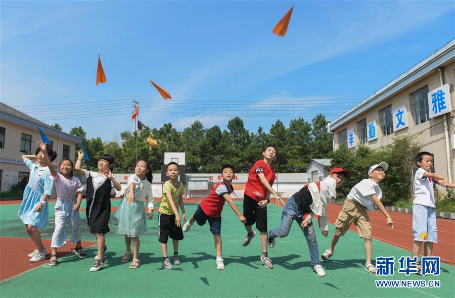 7月21日,在余姚市小曹娥镇的辛慧学校暑期乐园里,孩子们进行纸飞机放飞比赛。
