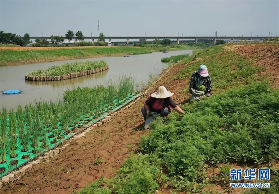7月21日,环卫工人在秦皇岛市海港区东港镇富家营村附近的排洪河河堤管护花草。