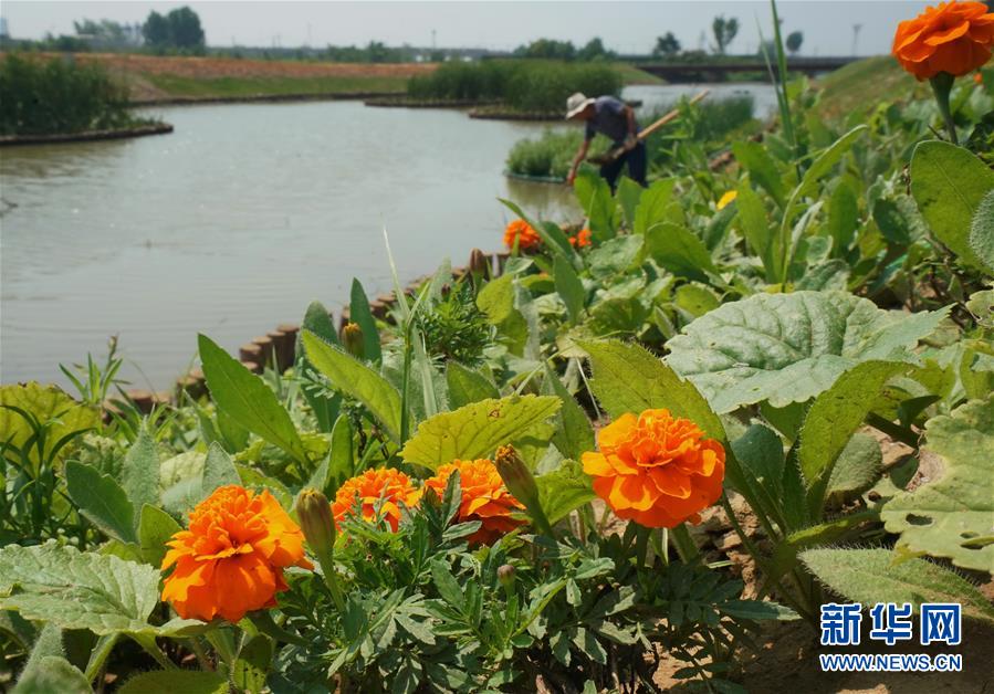 7月21日,环卫工人在秦皇岛市海港区东港镇富家营村附近的排洪河打捞漂浮物。