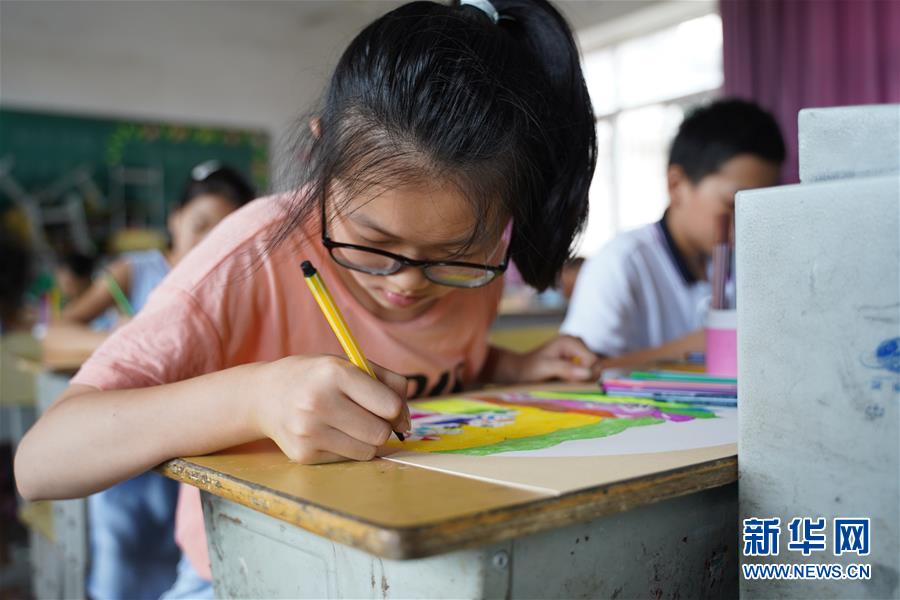 7月23日,在庐山市蛟塘镇中心小学安置点,小朋友在美术课上绘画。