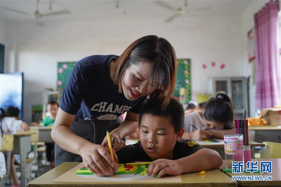 7月23日,在庐山市蛟塘镇中心小学安置点,一名老师在指导孩子绘画。新华社记者 张浩波 摄