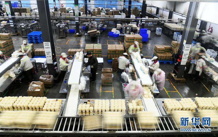 工人在位于贵州威宁经济开发区的雪榕生物科技有限公司生产车间包装金针菇(2019年10月17日摄)。新华社记者 杨文斌 摄