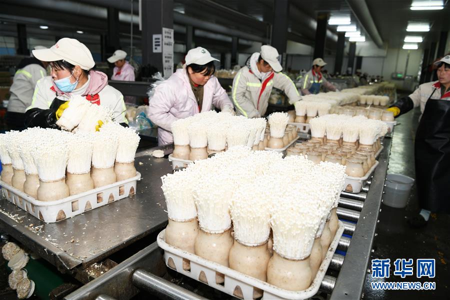 工人在位于贵州威宁经济开发区的雪榕生物科技有限公司生产车间包装金针菇(2019年10月17日摄)。新华社记者 杨文斌 摄