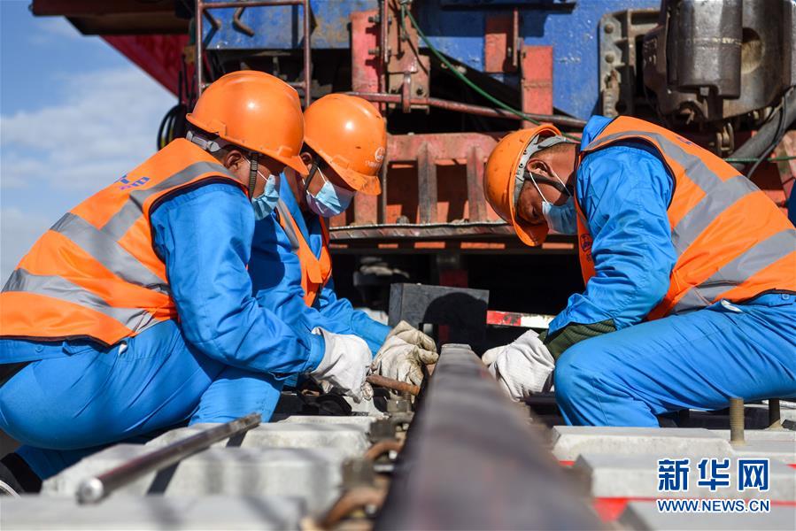 中铁一局的施工人员在格库铁路新疆段固定最后一组轨排(7月21摄)。新华社记者 丁磊 摄