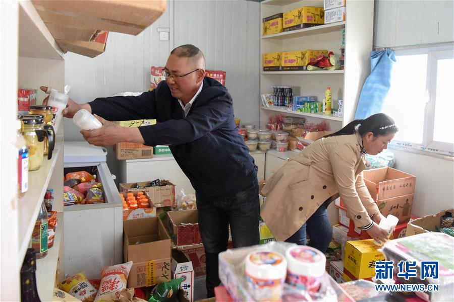 在索尔库里宿营地,铁路工人赵桂建(左)帮助妻子整理“白皮列车”上平价商店的商品(7月19日摄)。新华社记者 丁磊 摄
