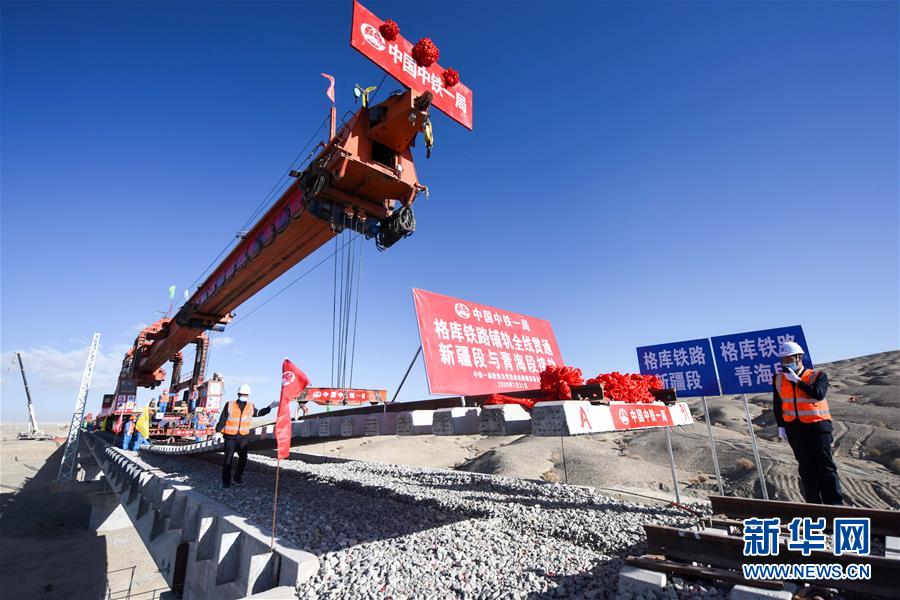 中铁一局的施工人员在格库铁路新疆段铺设最后一组轨排(7月21日摄)。新华社记者 丁磊 摄
