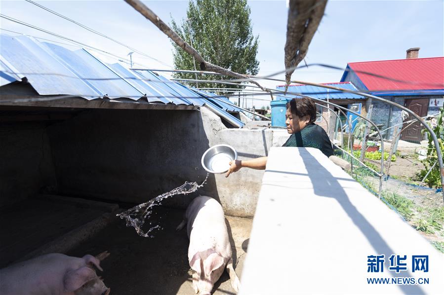 7月23日,在黑龙江省抚远市浓桥镇东方红村,康丽艳向猪圈中洒水降温。 新华社记者 谢剑飞 摄