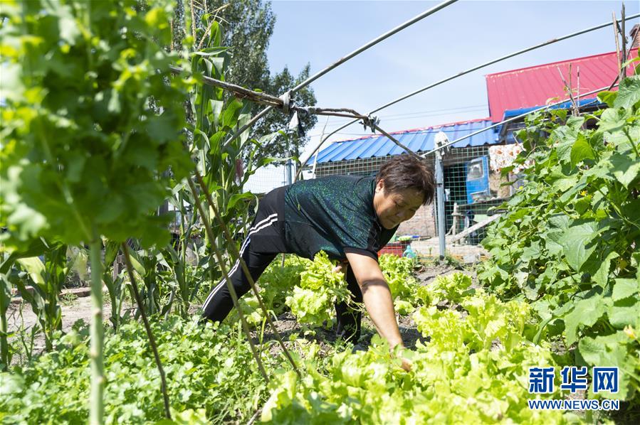 7月23日,在黑龙江省抚远市浓桥镇东方红村,康丽艳在自家庭院中摘菜。 新华社记者 谢剑飞 摄