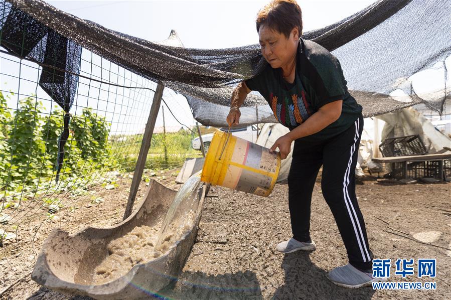 7月23日,在黑龙江省抚远市浓桥镇东方红村,康丽艳在给鸭和鹅准备饮用水。新华社记者 谢剑飞 摄