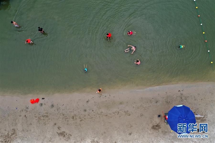 7月25日,游客在武汉东湖沙滩浴场游玩(无人机照片)。