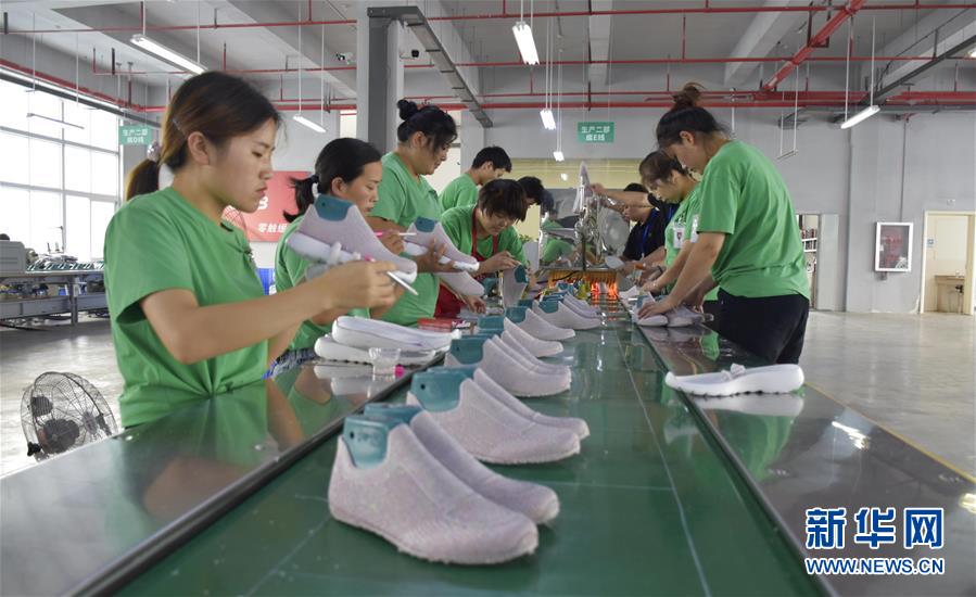 河南省鹿邑县多走路智造(河南)科技有限公司生产车间内,工人在流水线上忙碌(7月14日摄)。新华社记者 韩朝阳 摄