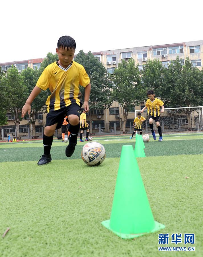 7月27日,在石家庄市柏林南路小学,学生们在进行足球盘带训练。 新华社发(梁子栋 摄)