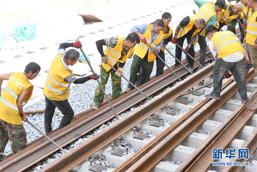 7月28日,施工人员在福州长乐松下站长轨换铺现场作业。