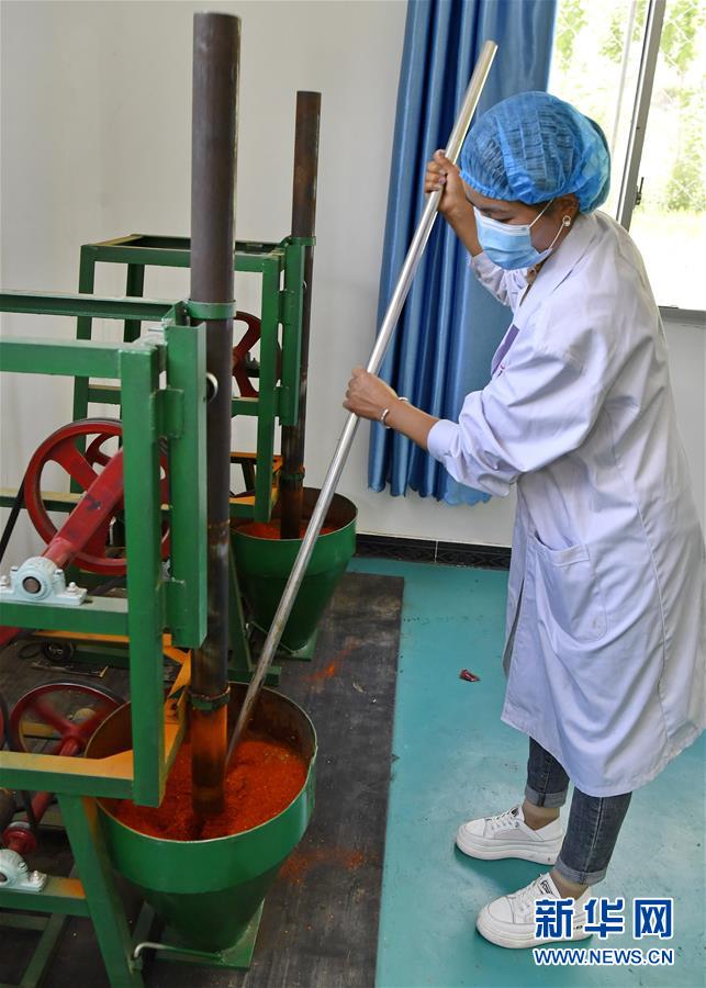 朗县诺贡辣椒销售及农产品加工农牧民专业合作社的社员在加工辣椒粉(7月27日摄)。新华社记者 张汝锋 摄