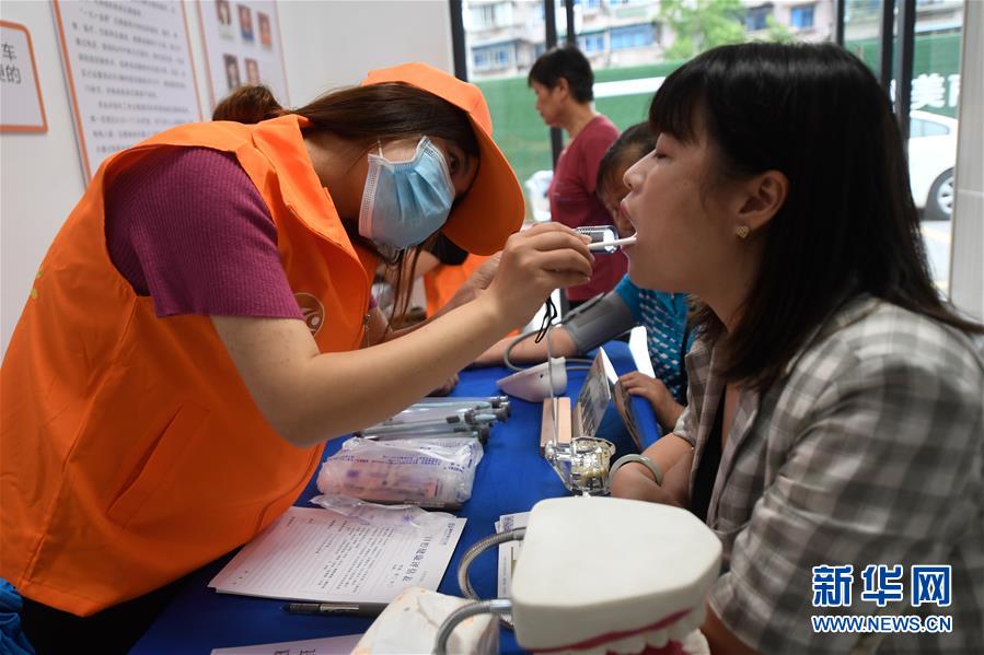 7月28日,志愿者在吉山四社区“新时代文明实践站”为居民免费检查牙齿护理情况。