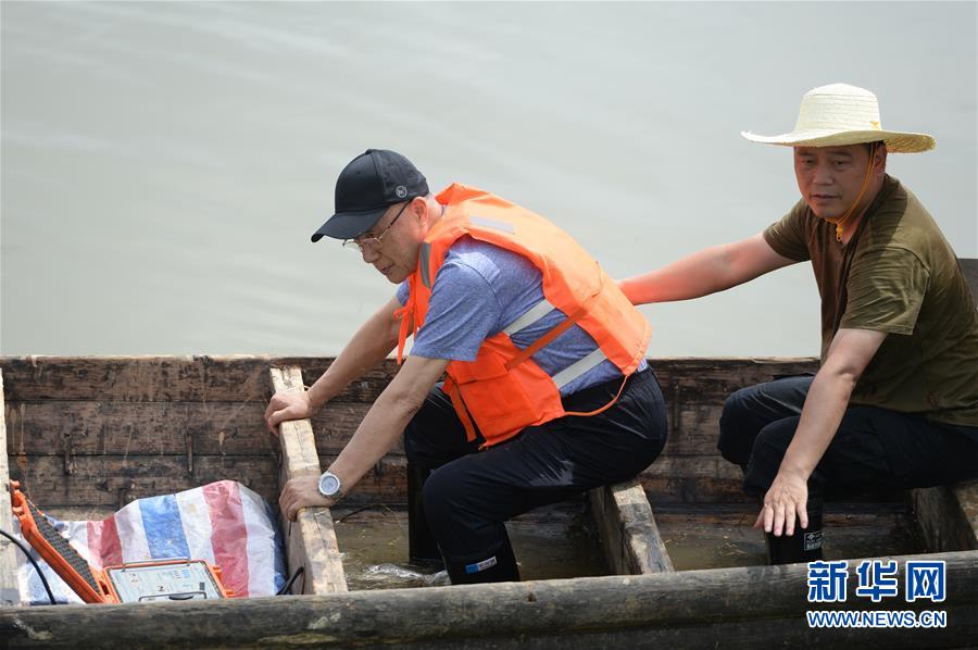 7月28日,在临湘市聂市镇毛湾垸,何继善(左)查看检测仪使用情况。新华社发(陈振海摄)