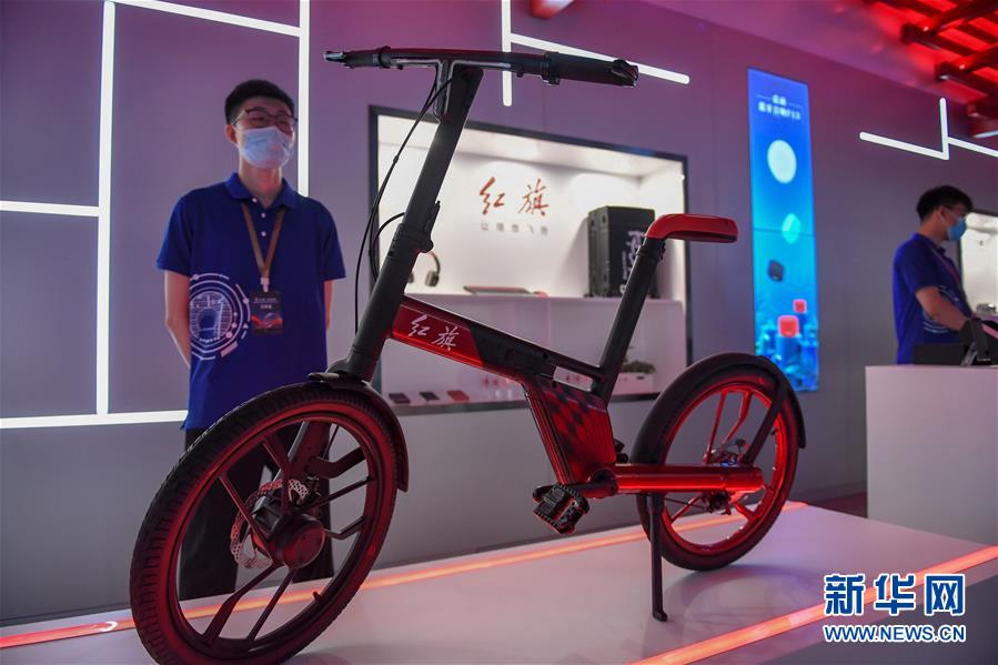 这是在红旗创新大厦内展出的红旗电动自行车(7月28日摄)。