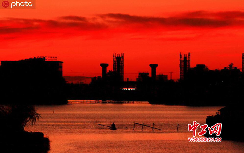 2020年7月30日清晨,一大片美丽的火烧云出现在浙江绍兴市区上空。
