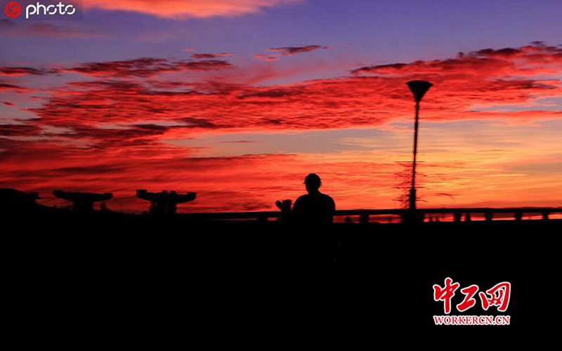 2020年7月30日清晨,一大片美丽的火烧云出现在浙江绍兴市区上空。