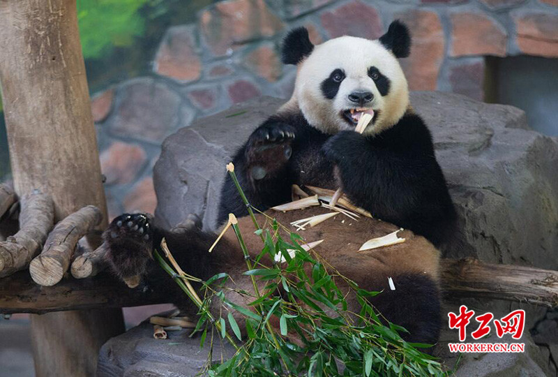 2020年8月3日,在南京红山森林动物园,大熊猫在空调房里进食。