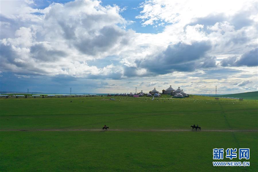 游客在呼伦贝尔陈巴尔虎旗天下草原游牧部落里骑马游玩(8月3日摄,无人机照片)。 今年暑期,内蒙古呼伦贝尔通过暂行周末2.5天弹性休假工作制度,发放旅游、餐饮消费券,景区推出优惠促销活动等措施,提振当地旅游市场。 新华社记者 徐钦 摄