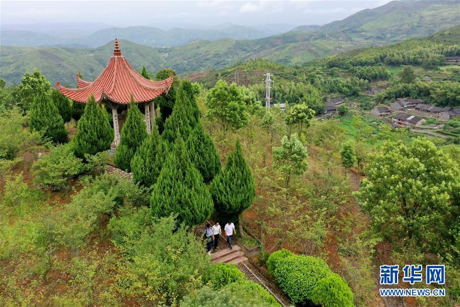 8月4日,游客参观福鼎市佳阳畲族乡周山村“光荣亭”(无人机照片)。 近年来,福建省福鼎市佳阳畲族乡立足本地优势,大力发展特色农业、蓝色海洋经济和红色畲乡旅游,走出一条富有闽东特色的乡村振兴之路。2019年全年农民人均可支配收入17660元。 新华社记者林善传摄