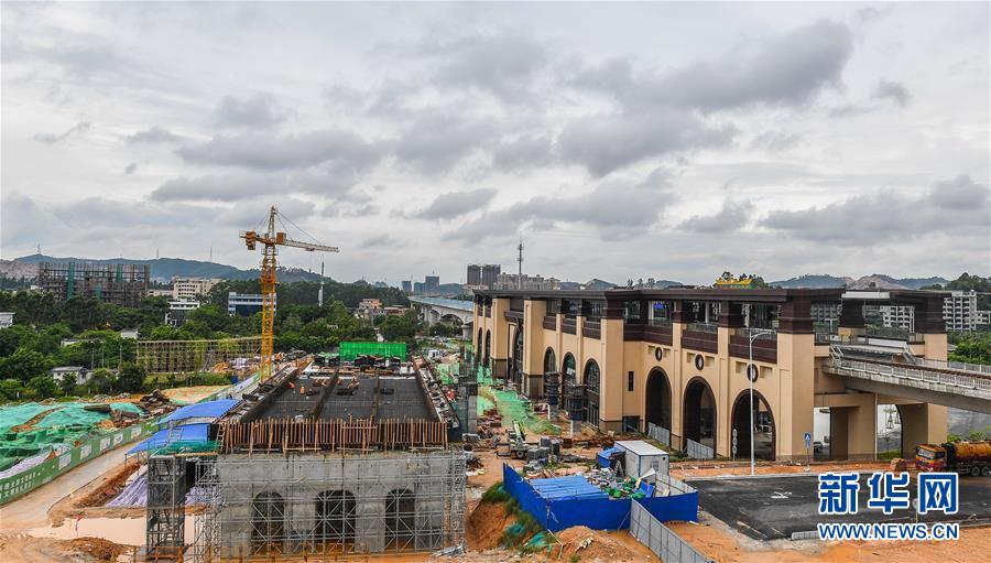 正在建设中的清远磁浮银盏温泉站紧邻广清(广州至清远)城际铁路银盏站(画面右侧,8月5日摄)。 目前,广东首条中低速磁浮线——清远磁浮旅游专线项目建设有序推进。广东清远磁浮旅游专线项目全长约38公里,分两期建设。首期全长8.014公里,将在9月份开始铺轨,预计在2020年底实现主体工程全面完工。 新华社记者 刘大伟 摄