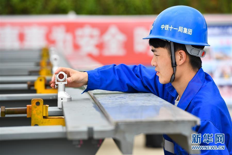 8月5日,中铁十一局技术员在清远磁浮轨排基地的试验梁轨排上放置精调棱镜。 目前,广东首条中低速磁浮线——清远磁浮旅游专线项目建设有序推进。广东清远磁浮旅游专线项目全长约38公里,分两期建设。首期全长8.014公里,将在9月份开始铺轨,预计在2020年底实现主体工程全面完工。 新华社记者 刘大伟 摄