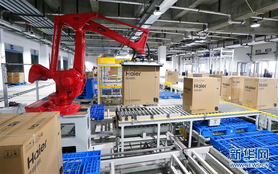 8月5日,在日日顺物流(即墨)产业园的大件物流智能无人仓,码垛机器人在搬运商品。 在位于山东省青岛市即墨通济新经济区,由日日顺物流打造的首个大件物流智能无人仓今年夏季投入运行。该无人仓应用全景智能扫描站、关节机器人、吸盘龙门拣选机器人等多项定制智能设备,采用5G和视觉识别、智能控制算法等人工智能技术,可实现冰箱、空调等大件商品24小时不间断分拣作业。 新华社发(梁孝鹏 摄)