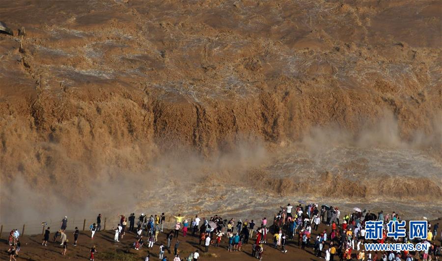 8月10日,游客在山西吉县黄河壶口瀑布景区欣赏洪峰过后的壮美瀑布群。 当日,受黄河上游洪峰影响暂时关闭的黄河壶口瀑布景区恢复开放,景区工作人员重新安装好防护栏,并设立警戒区域,确保游客安全。 新华社发(吕桂明 摄)