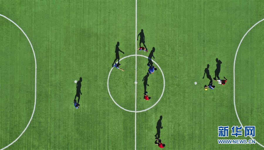8月10日,小球员们在河北唐山遵化市东旧寨镇梁屯中心小学足球场进行对抗训练(无人机照片)。 暑假期间,许多学生通过参加球类运动的训练提高运动水平、强身健体,感受运动的魅力。 新华社发(刘满仓 摄)