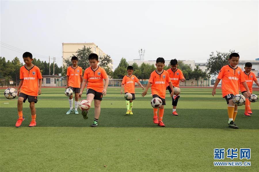 8月10日,小学生在山东省滨州市博兴县一家足球俱乐部进行足球训练。 暑假期间,许多学生通过参加球类运动的训练提高运动水平、强身健体,感受运动的魅力。 新华社发(陈彬 摄)