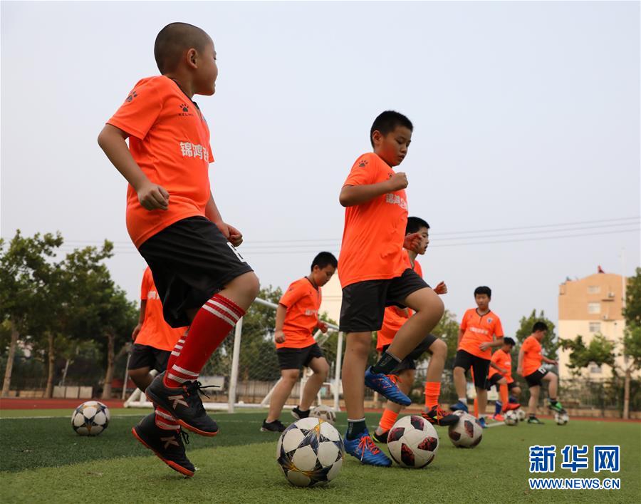 8月10日,小学生在山东省滨州市博兴县一家足球俱乐部进行足球训练。 暑假期间,许多学生通过参加球类运动的训练提高运动水平、强身健体,感受运动的魅力。 新华社发(陈彬 摄)