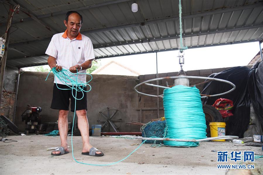 王惠安在家中整理养殖用具(8月10日摄),他是山东省长岛海洋生态文明综合试验区北长山乡北城村的一名扇贝养殖户。新华社记者 王凯 摄