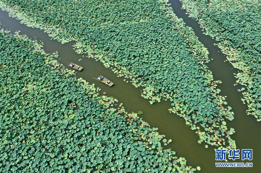 随着江苏省宿迁市泗洪县洪泽湖里的莲蓬逐渐成熟进入采收期,当地村民冒着高温驾舟采收莲蓬。据介绍,洪泽湖泗洪辖区荷藕面积近十万亩,亩产鲜莲子约300斤。 新华社发(许昌亮 摄)