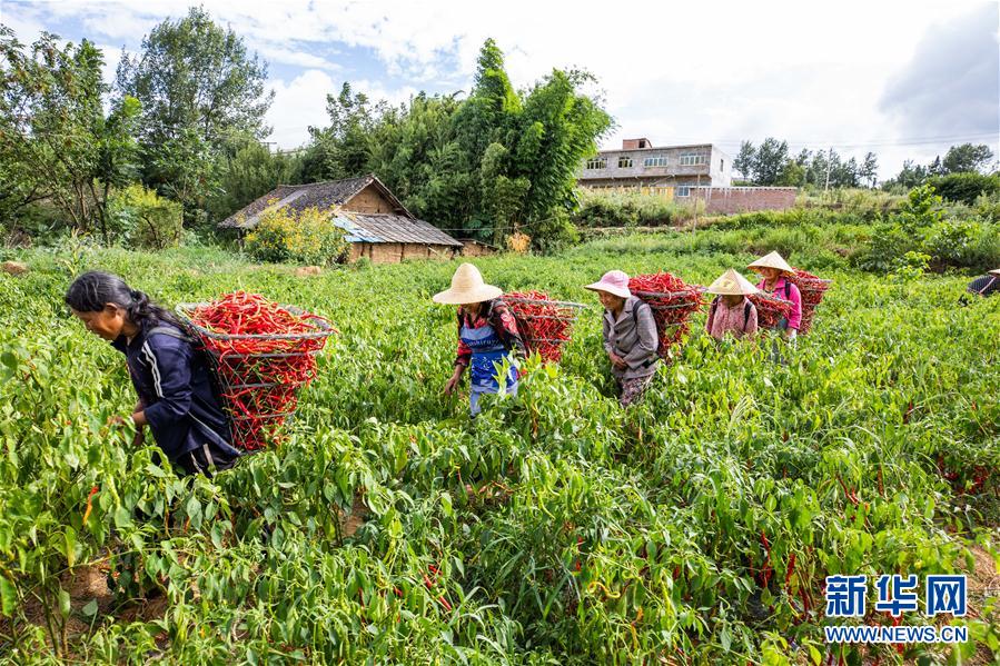 8月17日,在贵州省毕节市金海湖新区常丰社区,村民将采收的辣椒装筐运走。 近日,贵州省毕节市各地辣椒喜获丰收,村民们纷纷抢抓农时采收辣椒,田间地头一派繁忙景象。近年来,毕节市积极引导农民结合市场需求调整种植结构,以村民自种和“公司+基地+农户”模式,发展特色辣椒种植,为群众开辟增收致富新途径。 新华社发(罗大富 摄)