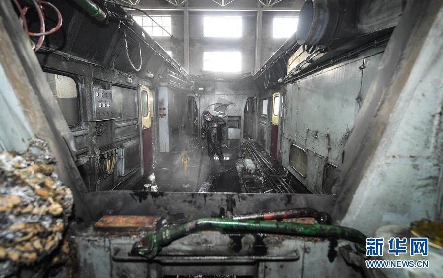 给火车头“洗澡”的工人