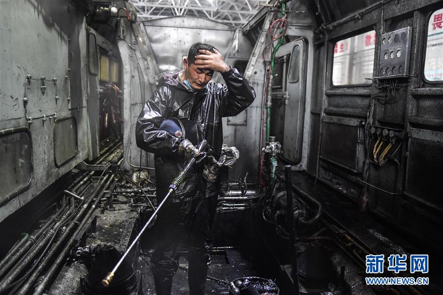 给火车头“洗澡”的工人