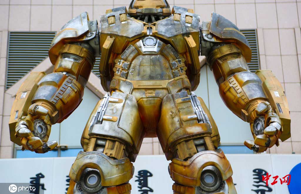 2020年8月23日,内蒙古呼和浩特市。玉泉区少年宫附近的街道上,惊现漫威电影“超级英雄”绿巨人浩克和钢铁侠反浩克装甲,造型逼真,格外引人注目。其中,“反浩克装甲钢铁侠”3.5米高,重约1.3吨,力量感十足;“绿巨人浩克”也有3米多高,青筋暴突,肌肉虬结,似乎已经进入“战斗模式”。两名“超级英雄”矗立在平台上如同“门神”,成为街头一道独特的风景线。(黄逗/IC photo )