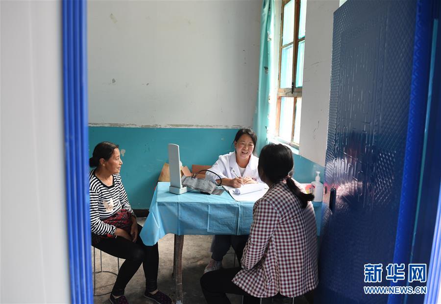 8月23日,洛南县医务人员(中)在峪口小学安置点为受灾群众看病。新华社记者 陶明 摄