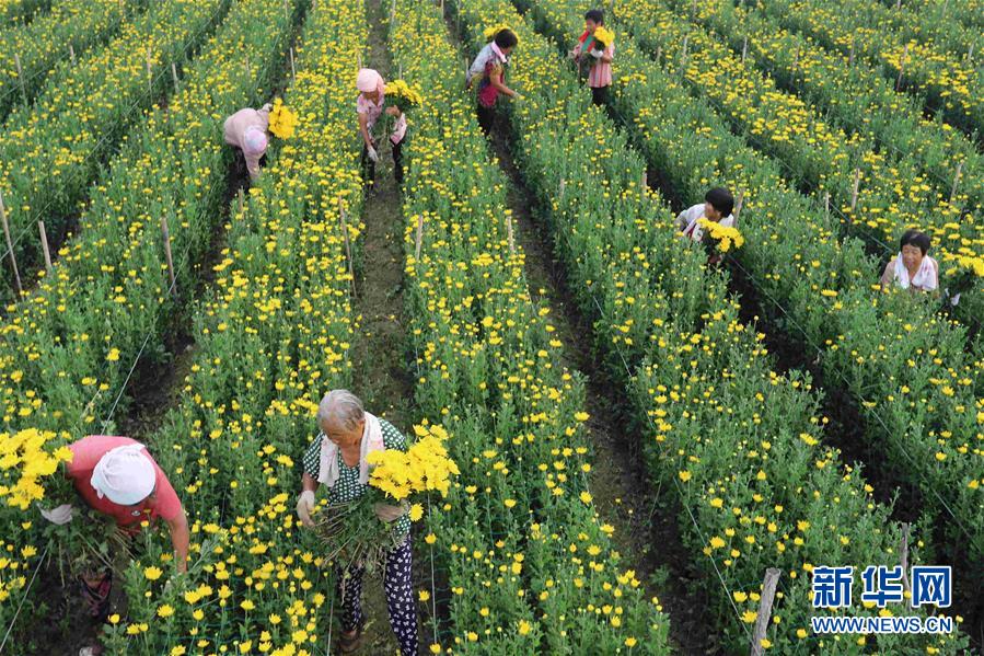 8月23日,在临西县吕寨镇石佛寺村菊花种植基地,种植户在采收菊花。 近日,河北省临西县吕寨镇石佛寺村菊花种植基地的200多亩菊花进入收获期,种植户正在加紧采收。据悉,菊花种植是临西县扶持推广的高效农业示范项目,采取“基地+农户”模式,产出的鲜切菊花销往天津、武汉、郑州等城市的鲜花批发市场和礼仪公司,成为当地群众增收的重要途径。 新华社发(张玉坤 摄)