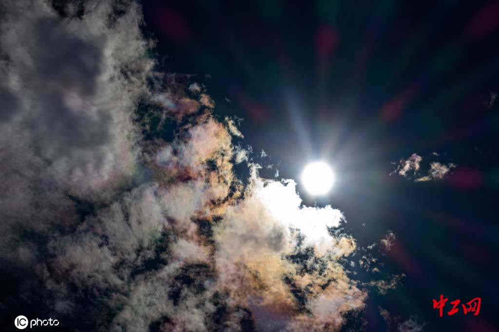 2020年8月24日,北京暴雨过后,天空出现七彩祥云。七彩云是典型“日华”现象,指太阳光线通过云彩中的冰晶结构产生的自然现象。在合适的天气状况下,太阳光和云构成一个合适的角度,通过折射和反射作用,上空云彩内的水汽将太阳光谱分离,散射出七色光芒。(宋佳音/IC photo)