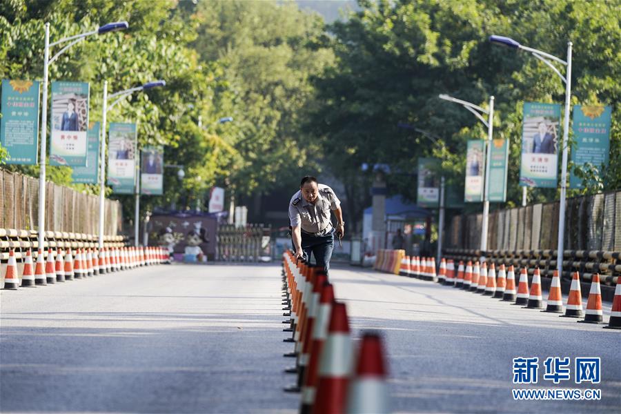 8月26日,在重庆市江北中学,安保人员在大门口摆放隔离桩。 新华社发(秦廷富 摄)